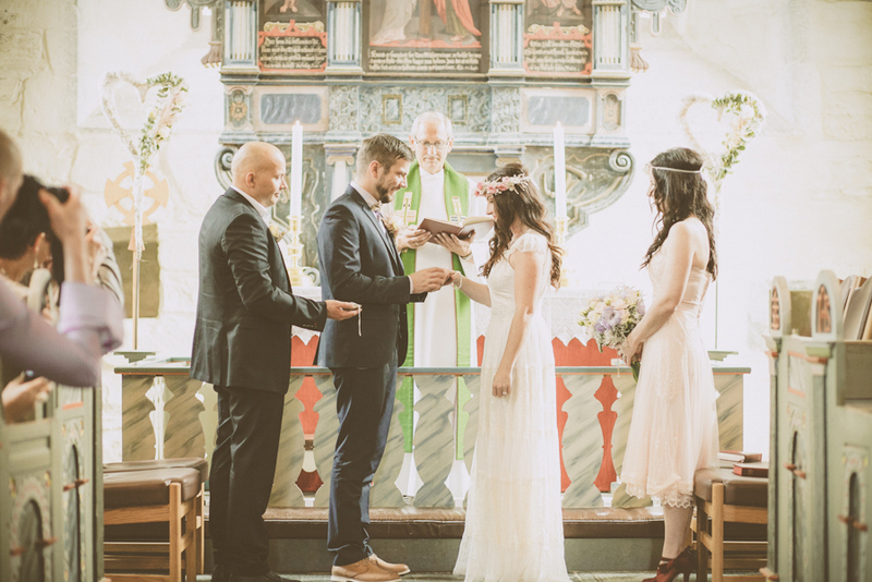 Det ser ut som den vakreste drøm, dagen i august da Linda & Thor giftet seg på en av de fineste stedene i hele Norge; Utstein Kloster på Mosterøy. Alt er så nydelig vakkert at superlativene på godt norsk ikke strekker til. Hvor begynner man, når man forelsker seg i alt. Brudens røde neglelakk, skoene er til å dø av, og vi elsker slike brude booties. Brudebuketten er som en varm sommerdag, med et slør av solens vakre lys. De duse pastellfargene matcher blomster-kransen i håret perfekt, og den vakre blondekjolen til Laura, fullfører boho vintage stilen helt komplett. Og ved hennes side en ulastelig antrukket  brudgom, som må sies å være den kuleste norske brudgommen vi har publisert hittil i år. For en dress, for en gjennomført stil og for noen stilige farger. NWB digger blå dresser, sixpence, lommeur og tversoversløyfe. Og når stilen er gjennomført ned til minstemann i bryllup er det nesten mer enn enn hva hjertet klarer å begjære. Bruden har selv stått for all styling, og hun har gjort en utsøkt jobb. Den fantastiske Laura Vokey Photography, har fanget bryllupsdagen til Thor & Linda så nydelig som overhodet mulig. We love the softness and colors of her images - breathtakingly beautiful! Legg også merke til den utrolig vakre bryllupskaken fra Chelsea's Cool Cakes i deilig mint.